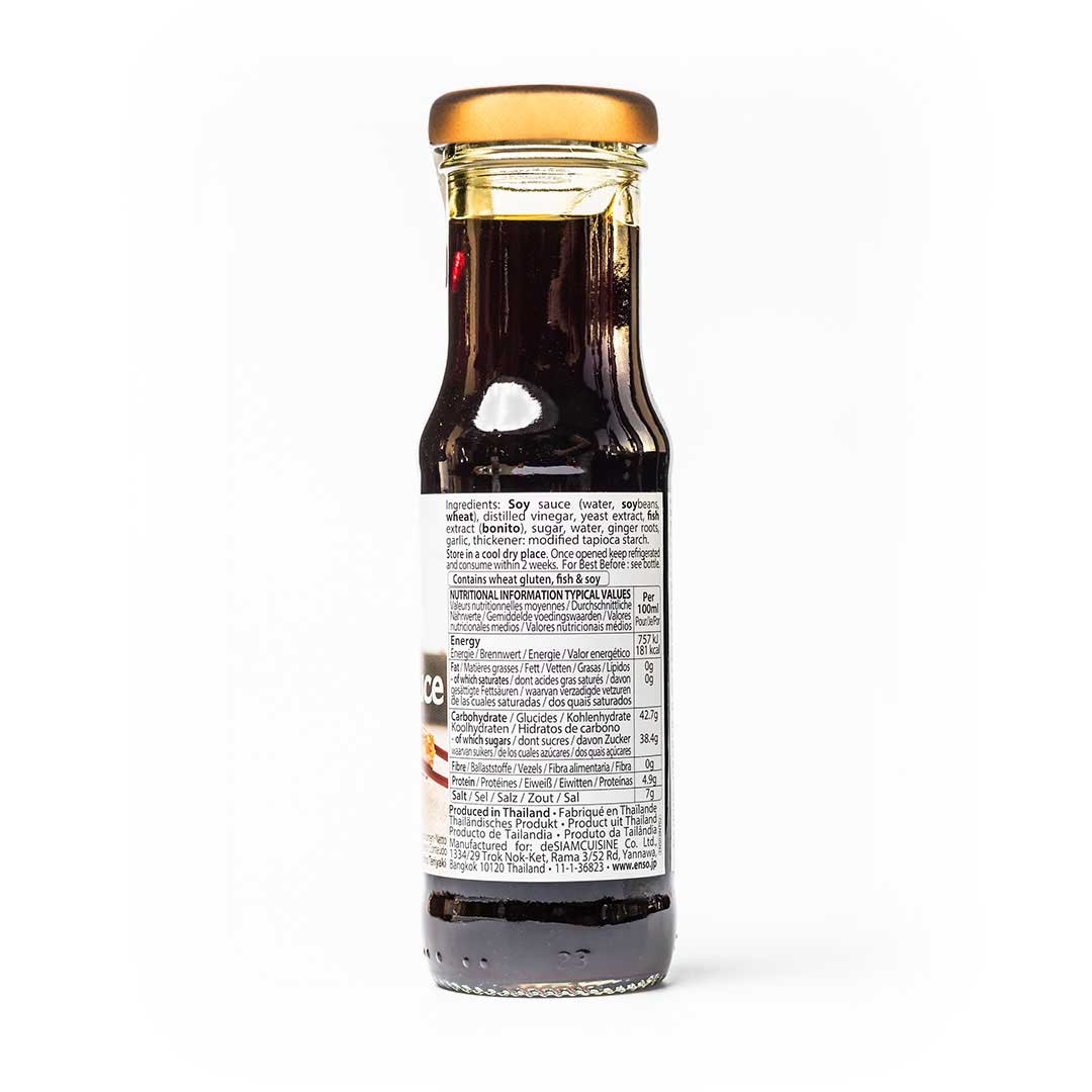 Ingredients: Soy Sauce (Water, Soybeans, Wheat Flour, Salt, Sugar), Distilled Vinegar (Water, Acidity Regulator: Acetic Acid), Yeast Extract, Fish Extract (Bonito), Sugar, Water, Ginger roots, Garlic, Thickener: Modified Tapioca Starch.