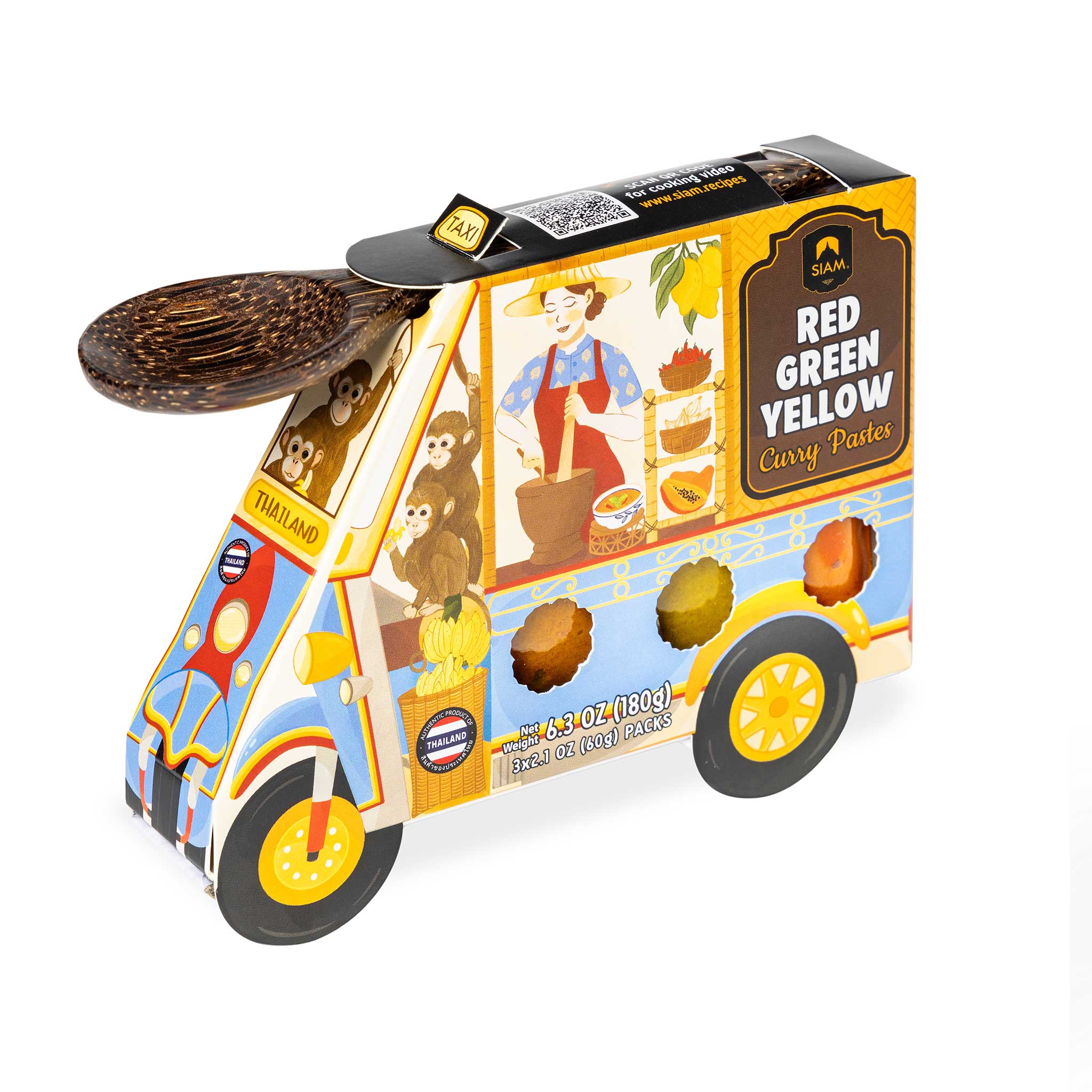 "Bring the flavors of Thailand to your kitchen with our Tuk-Tuk Curry Paste Gift Box! Featuring three authentic Thai curry pastes—Red, Green, and Yellow—this beautifully designed box captures the essence of Thai street food culture. Complete with a charming coconut spoon, it's the perfect gift for food lovers!"