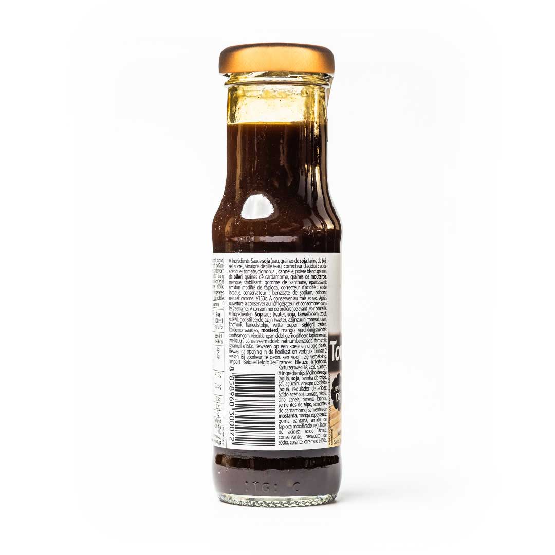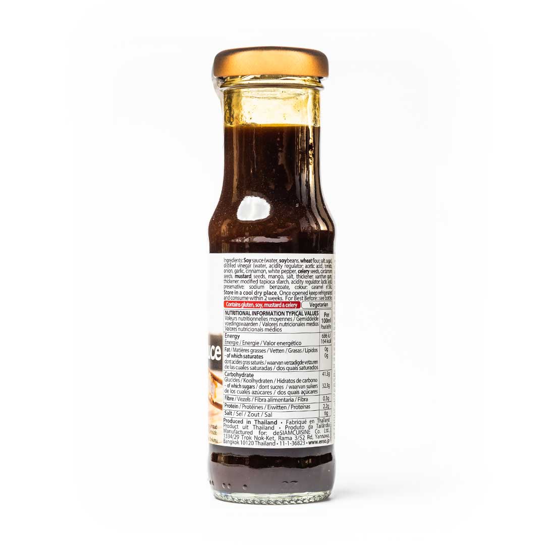 Ingredients: Sugar, Soy Sauce (Water, Soybeans, Wheat Flour, Salt, Sugar), Water, Water, Distilled Vinegar (Water, Acidity Regulator: Acetic Acid), Tomato, Onion, Garlic, Cinnamon, White Pepper, Celery Seeds, Cardamom Seeds, Mustard Seeds, Mango, Salt, Thickener: Xanthan Gum, Thickener: Modified Tapioca Starch, Acidity Regulator: Lactic Acid, Preservative: Sodium Benzoate, Colour: Caramel E150C.